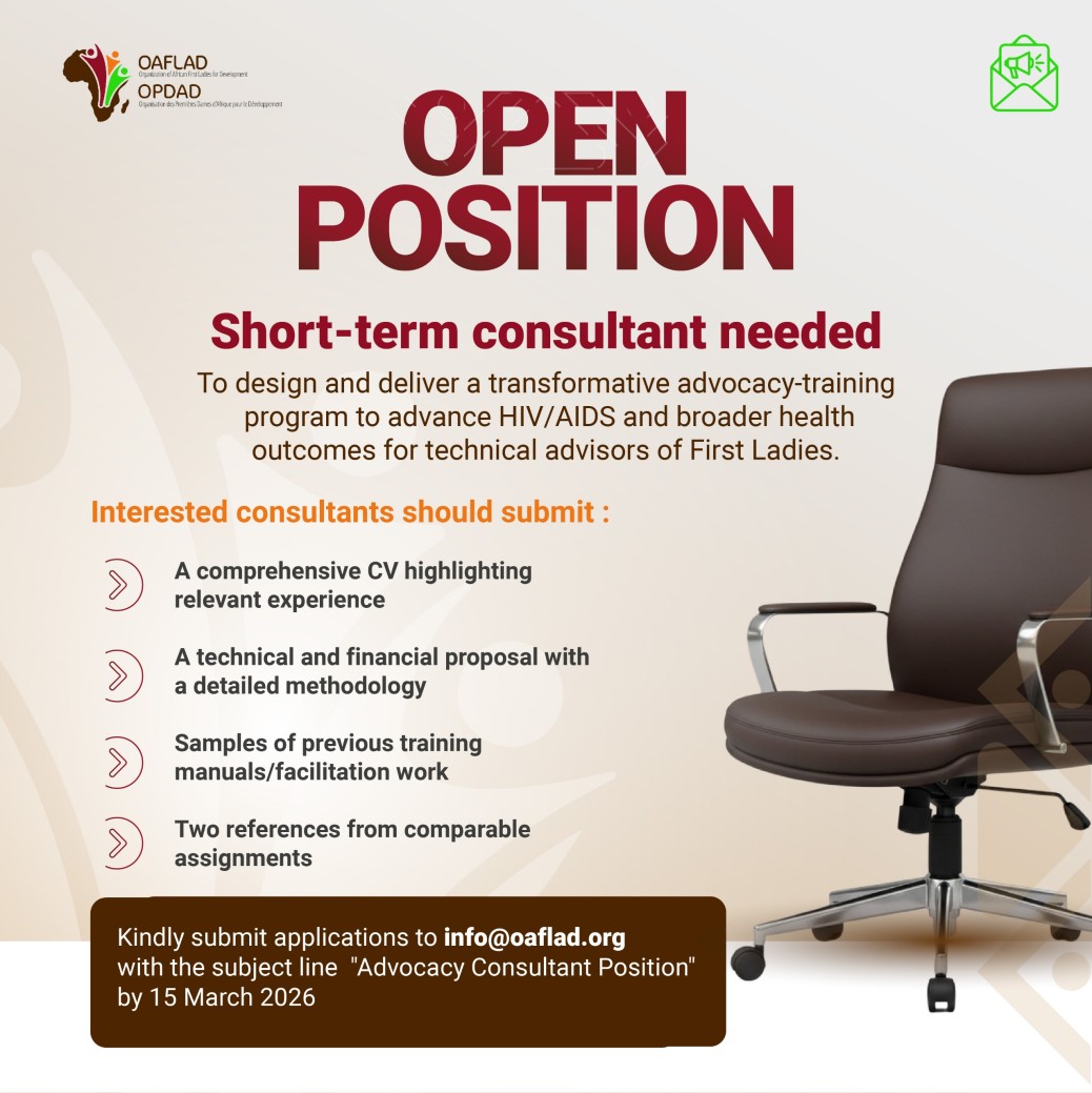 OAFLAD seeks an experienced facilitator to design and deliver a transformative advocacy-training program for African First Ladies’ Technical Advisors, developing sustainable capacity-building resources to advance HIV/AIDS advocacy and broader health initiatives .