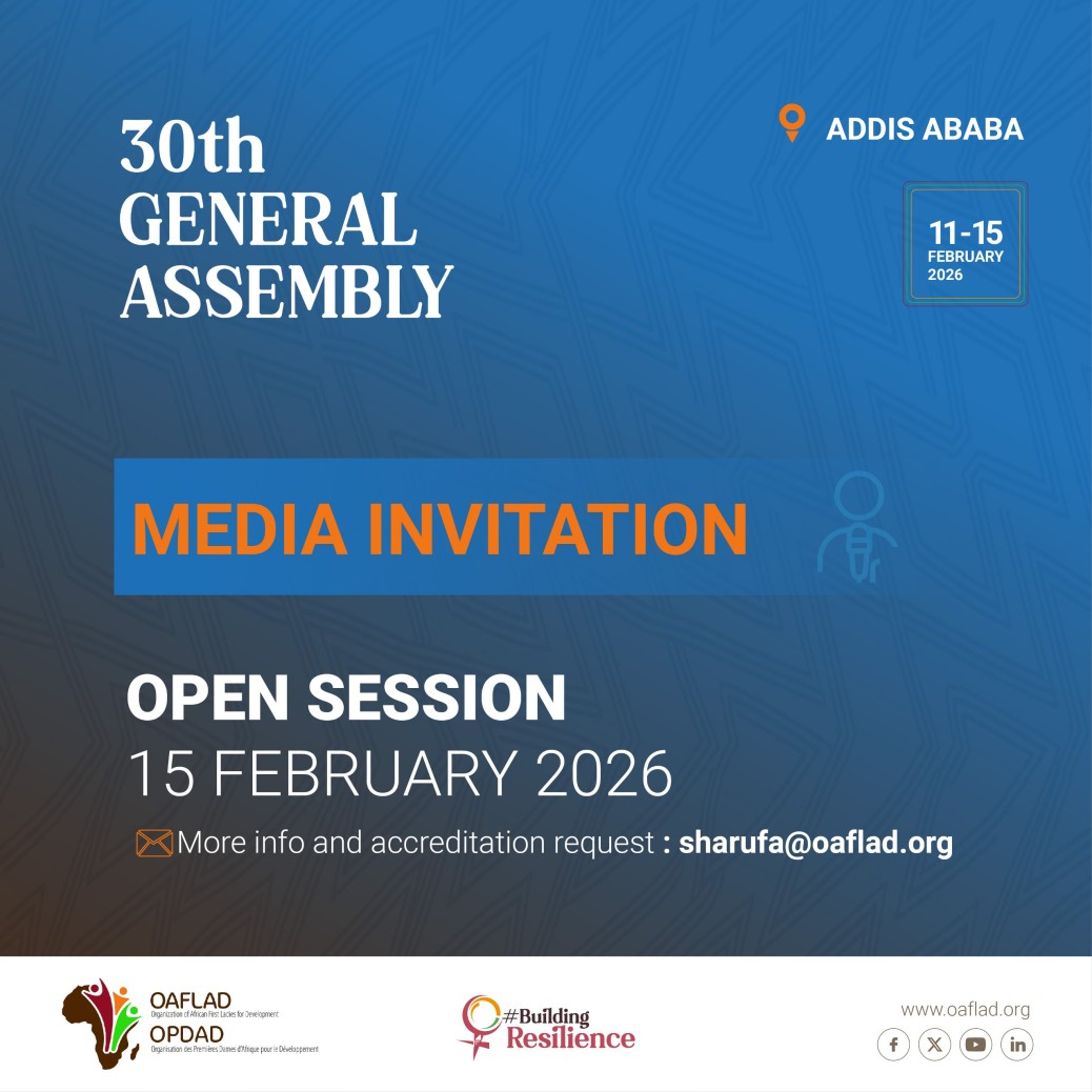For its 30th Ordinary General Assembly, the Organization of African First Ladies for Development (OAFLAD) is pleased to invite members of the media to cover the Open Session, scheduled for Sunday, 15 February 2026, at the African Union Commission (AUC) Old Building in Addis Ababa, under the theme: